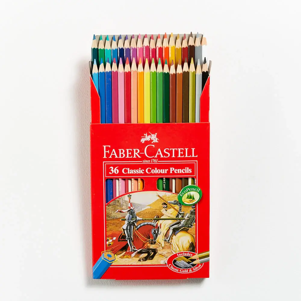 أقلام تلوين فابر كاستل الكلاسيكية (36 لون) تأتي بتشكيلة من الدرجات الزاهية المناسبة للرسم والتلوين والمشاريع الإبداعية. تتميز الأقلام بشكل سداسي لراحة اليد وسهولة الاستخدام مع ألوان سلسة في التطبيق.