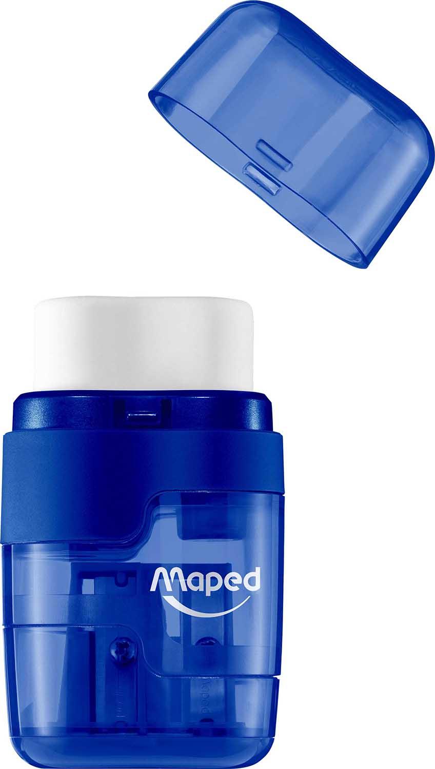 Maped DUO 2-Hole Sharpener with Eraser – A practical 2-in-1 design combining a pencil sharpener and a white eraser. Comes in assorted colors (blue, turquoise, purple). Clean sharpening system with container for shavings.