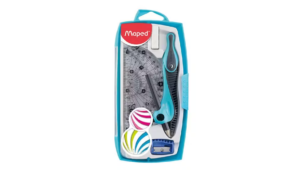 Maped math set includes a metal compass, ruler, protractor, set squares, eraser, sharpener, and pencil. Packed in a compact plastic case, it is convenient for school geometry and daily use.