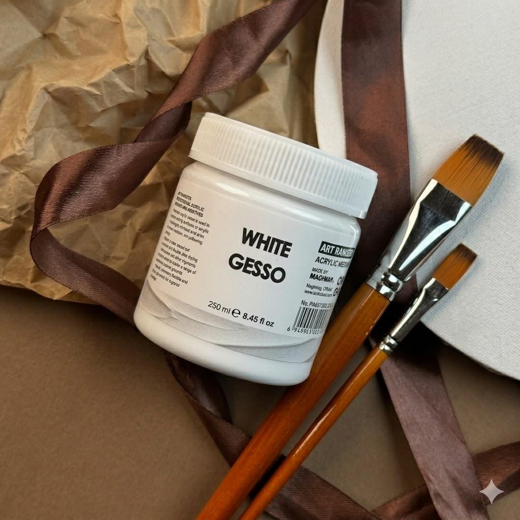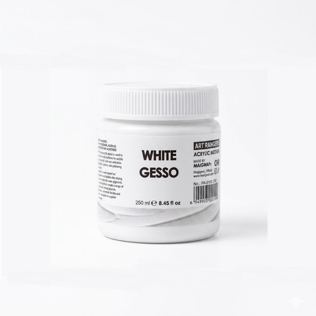 Art Rangers White Gesso 250ml is an acrylic-based primer designed to prepare surfaces for painting. It improves paint adhesion and creates a smooth, matte base for your artwork.