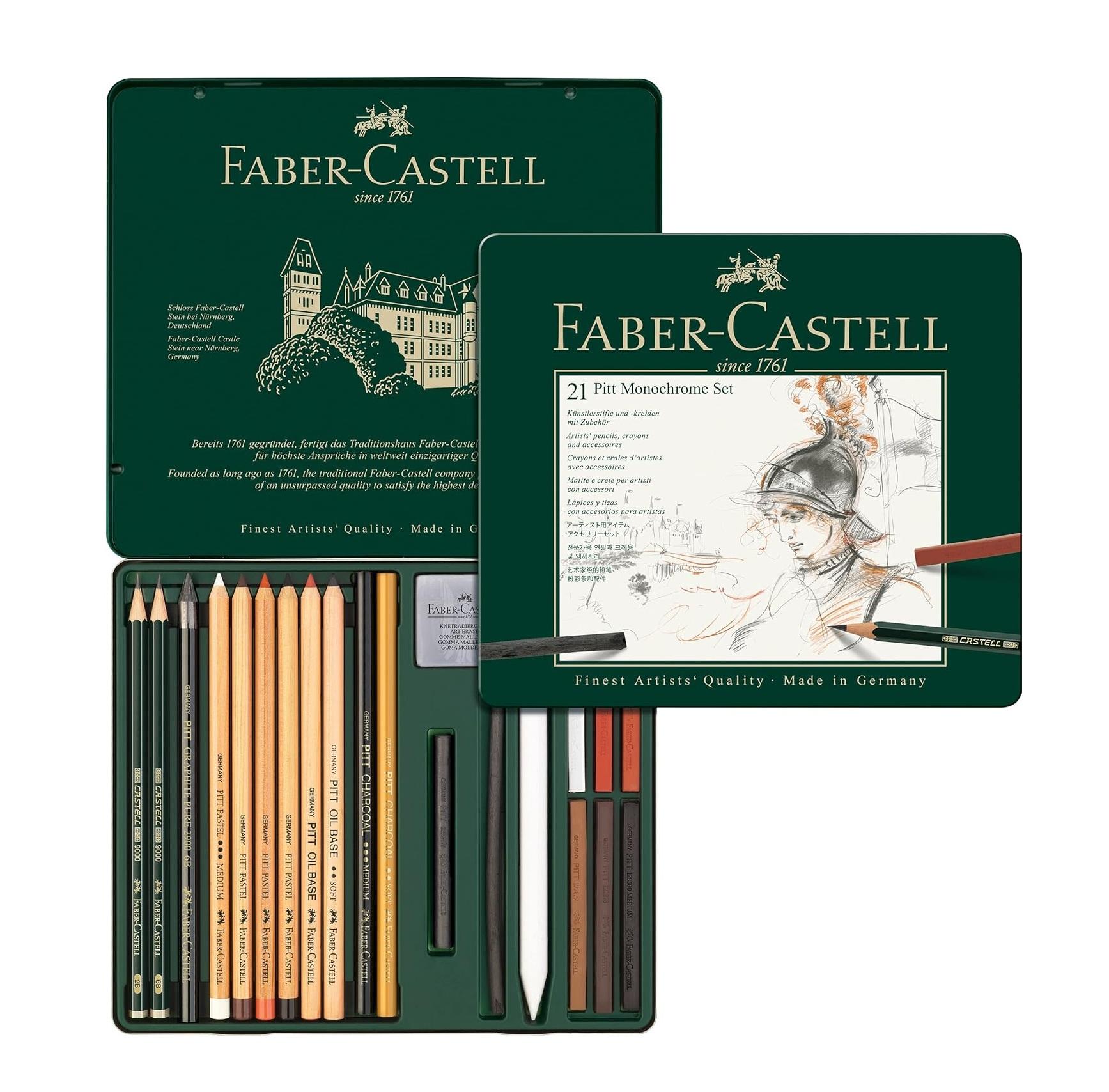 طقم فابر كاستل بيت مونوكروم يحتوي على 21 قلم فحم وجرافيت ناعم وعالي الجودة للرسم والتخطيط. يوفر الطقم مجموعة من الدرجات للأعمال الفنية الأحادية اللون والتظليل السلس.