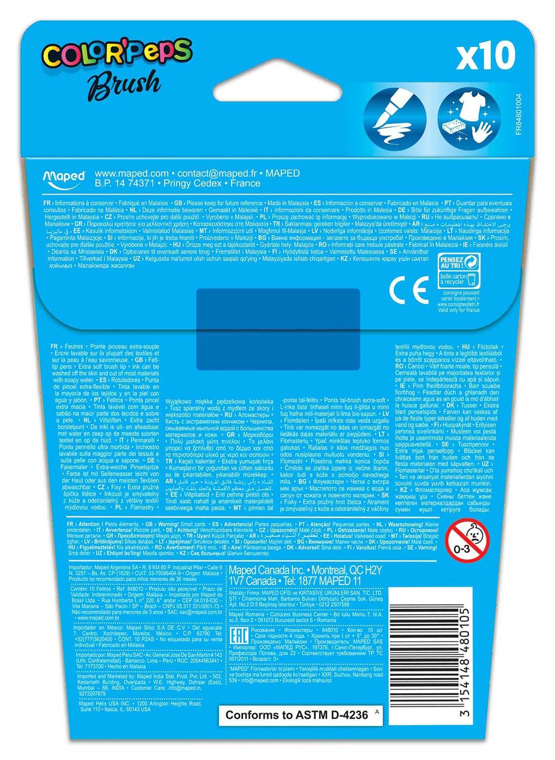 A set of 10 vibrant brush-tip markers designed for smooth coloring and artistic effects. The flexible brush tip allows both fine lines and broad strokes, making it perfect for kids and creative projects. Washable ink for easy cleanup.