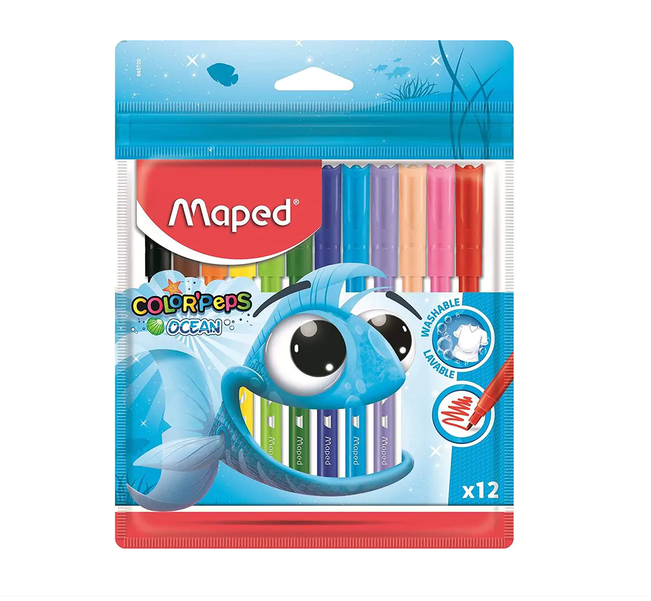 Maped Color’Peps Ocean – a pack of 12 washable felt tip pens in bright and vibrant colors. Designed with a soft tip for smooth coloring and safe use, these pens are perfect for kids’ creativity. Comes in ocean-themed packaging for extra fun.