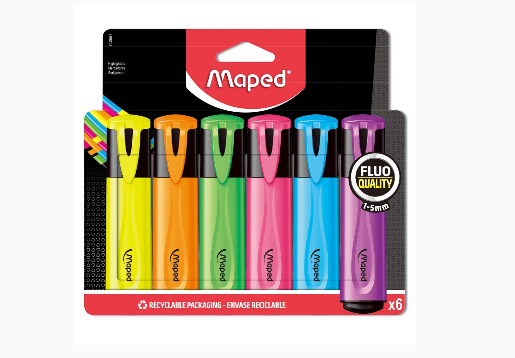 Maped Highlighter with fluorescent ink. Features a chisel tip (1–5 mm) for both fine underlining and broad highlighting. Available in assorted colors.